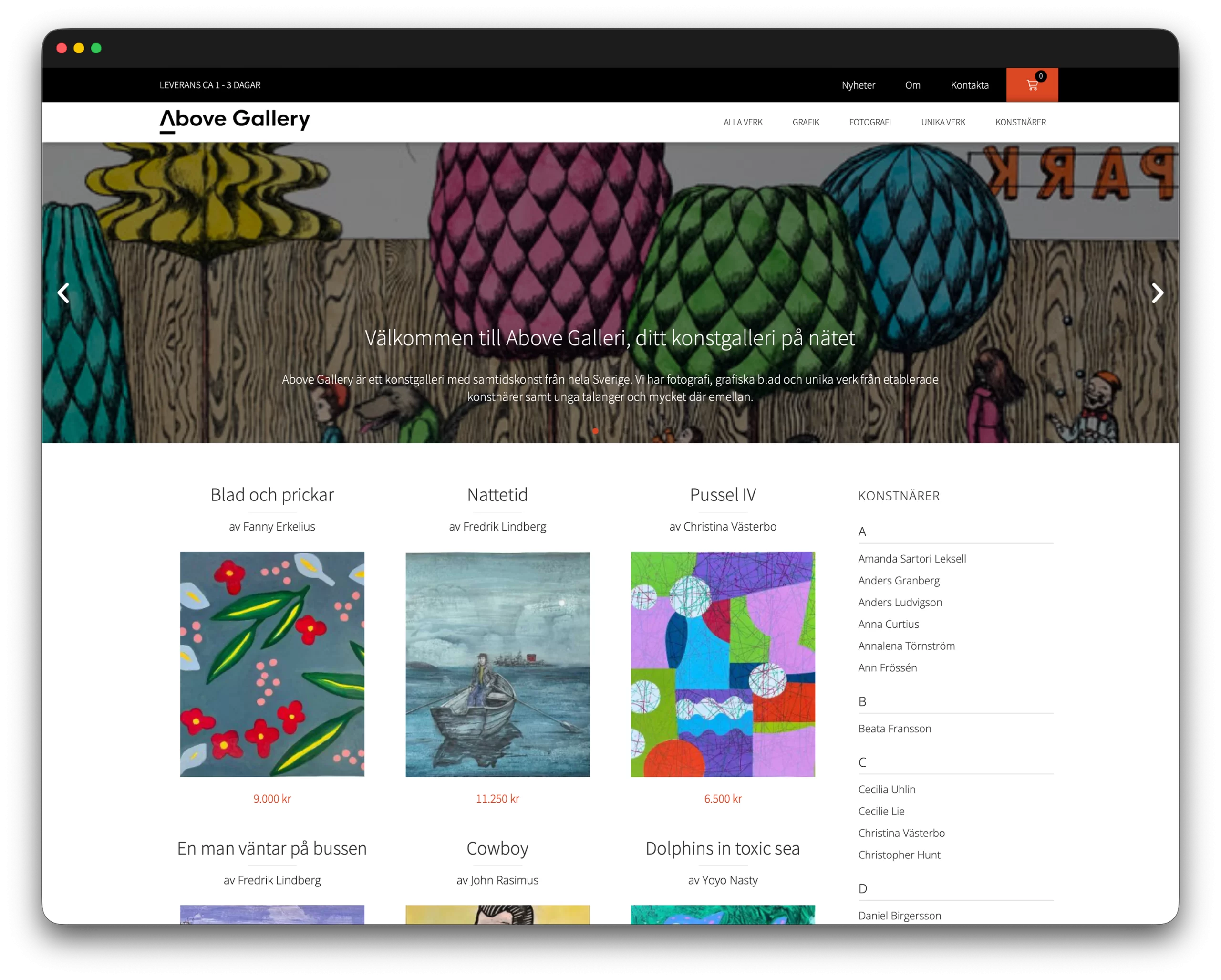Above Gallery är ett exempel på den typ av e-handelslösningar vi kan leverera. Webbplatsen är byggd med ett skräddarsytt WordPress-tema och en WooCommerce-butik, med integrerade betalsystem och koppling till Fortnox för snabbare och smidigare bokföring.